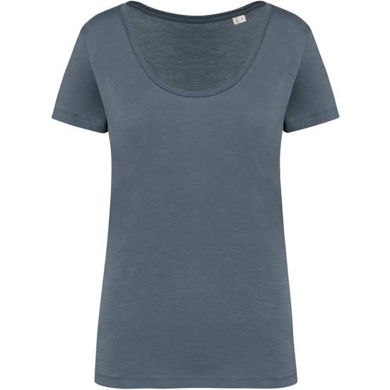 Le tee-shirt slub 130g pour femme en coton biologique peigné ringspun, avec tissu jersey aspect flammé, coupe regular et coutures latérales. Vêtement teint après montage : de légères variations de couleur peuvent apparaître. Col large à bords francs, bande de propreté intérieure, ourlet double aiguille.