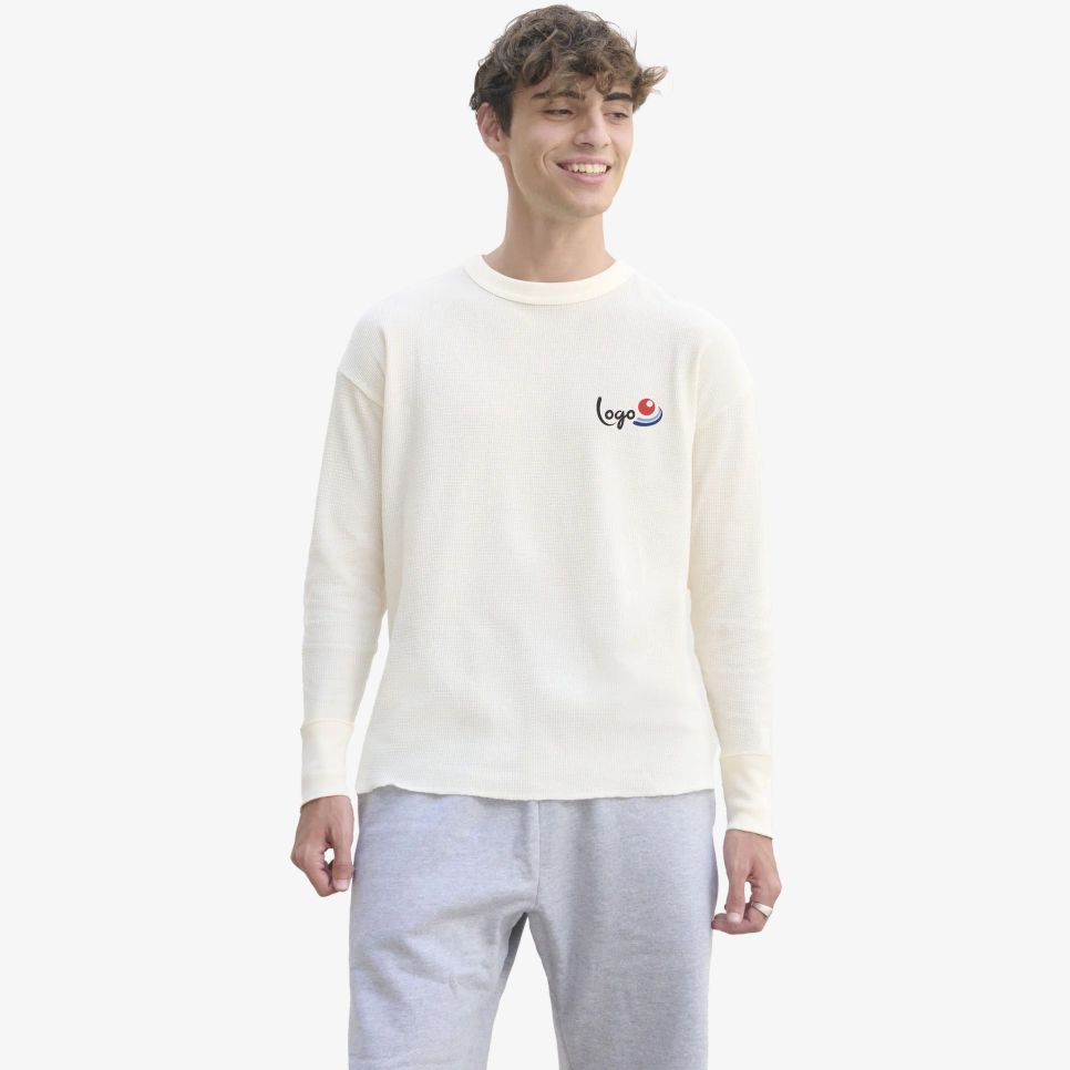 Le tee-shirt Thermal t est un tee-shirt gaufré thermal à manches longues, coupé cousu, avec finitions bord côte au col et aux poignets. Le coton non teinté, dont une part recyclée, convient à un usage quotidien. Option personnalisable.