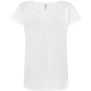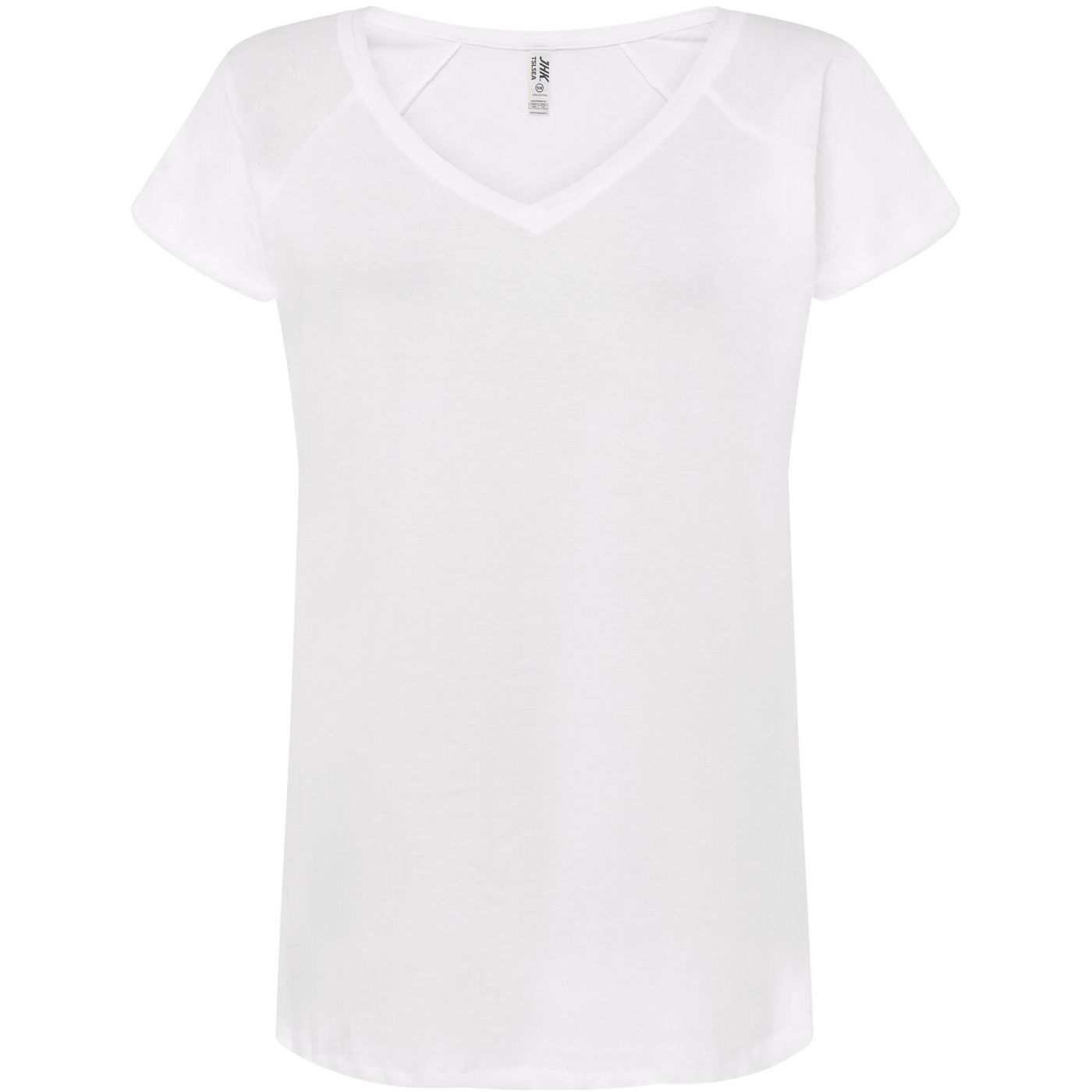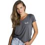 T-shirt femme style urbain. Col V en bords côte 1x1. Manches roulées. Ourlet arrondi. Lavé aux enzymes. Étiquette amovible. Composition : 100% coton