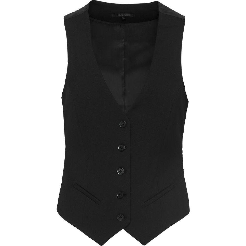 Le gilet femme à coupe ajustée avec fermeture devant 5 boutons, deux poches passepoilées et deux fentes côtés. Doublure en taffetas et patte de réglage au dos avec boucle métal. Convient à la personnalisation.