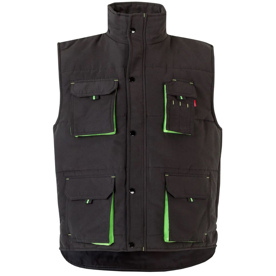 Gilet de travail sans manches. Fermeture grand zip. Soufflets des poches contrastés. Tirettes contrastées. 7 poches : 1 poche poitrine à soufflet et avec rabat, tirette et bande auto-agrippante. 2 poches avant à soufflet et avec rabat, tirette et bande auto-agrippante et en-dessous de chacune, 2 poches latérales. 1 poche poitrine à soufflet, avec rabat, bande auto-agrippante, tirettes et des compartiments pour stylos. 1 poche intérieure plaquée. Rabat avec boutons pression. Empiècements coupe-vent aux emmanchures. Composition : 100% polyester microfibre.