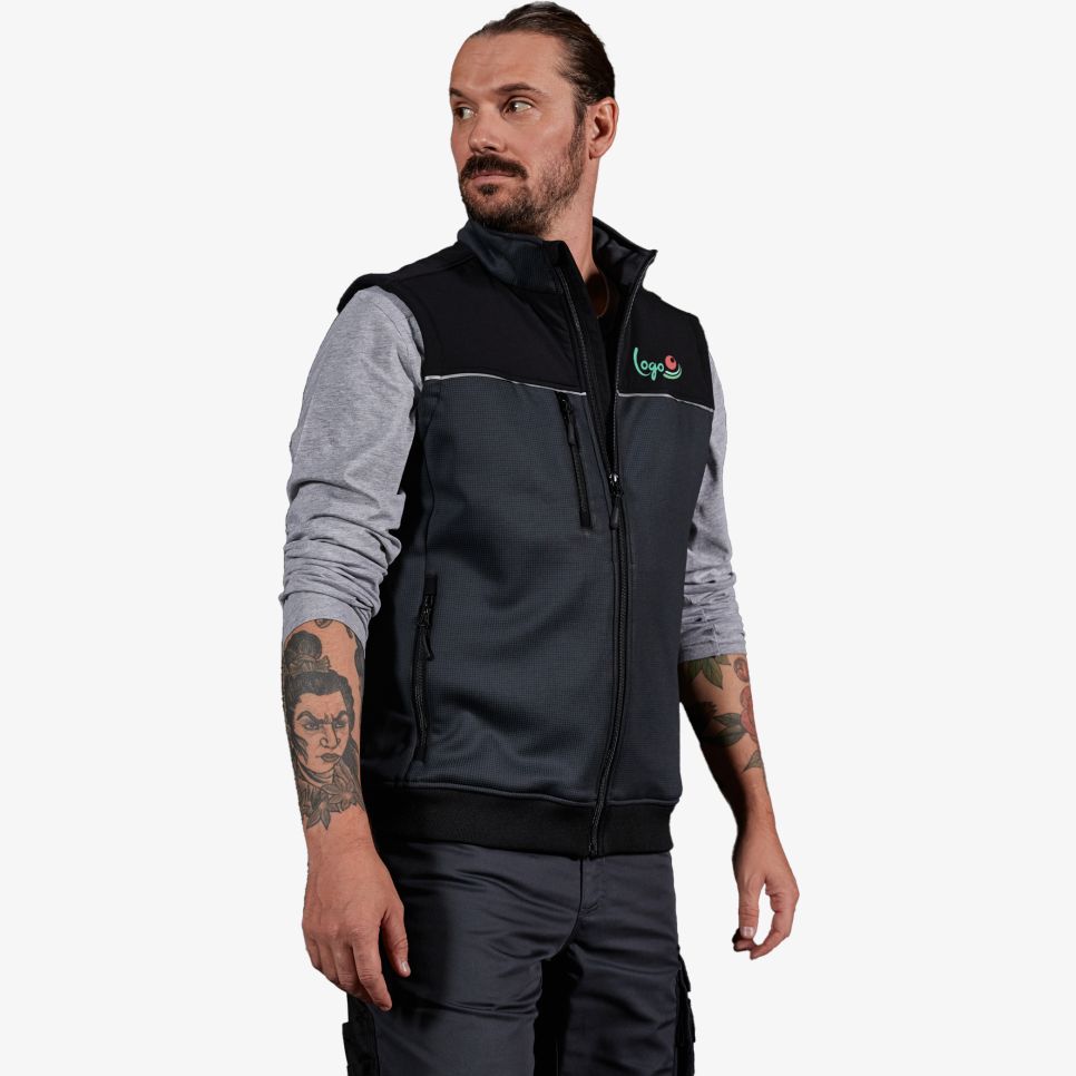 Le Hybrid Workwear vest est un bodywarmer softshell 2 couches avec intérieur Sherpa. Empiècements unis à l\"avant et à l\"arrière adaptés à la personnalisation. Col montant avec protège-menton, poches latérales et poche poitrine zippées, 2 poches intérieures, éléments réfléchissants décoratifs. Composition : tissu extérieur 96% polyester ; tissu extérieur 88% polyamide, 12% élasthanne ; rembourrage 100% polyester.