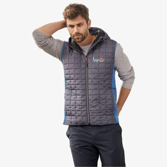 Le bodywarmer homme sans manches Knitted Hybrid vest en tissu doux d'aspect chiné, avec capuche réglable. Fermeture zippée couverte, poches latérales zippées et poches intérieures. Convient pour être personnalisé.