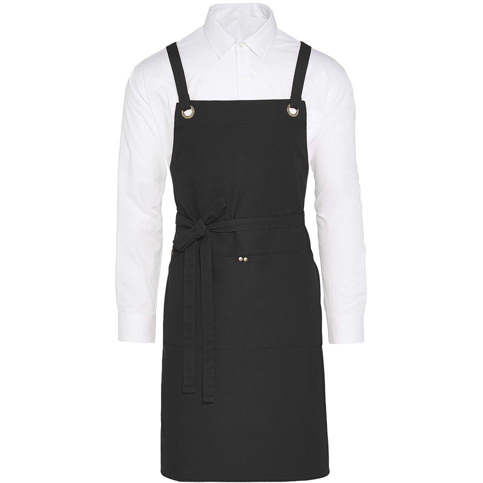 Avec ses 2 œillets et ses rivets en laiton vieilli, ce tablier à bavette en toile avec liens croisés dans le dos a été conçu pour lun usage professionnel ! Avec sa poche avant pratique et une longueur idéale pour une grande liberté de mouvement, il est parfait pour la restauration et le service. Tour de cou ajustable avec les 2 bretelles croisées dans le dos.