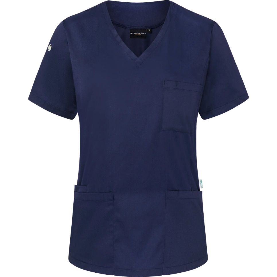 La blouse tunique manches courtes pour femme présente un col en V et une coupe légèrement ajustée adaptée aux activités dans les secteurs de la santé et de la beauté. Le tissu est composé de 65 % polyester recyclé certifié et 35 % coton.