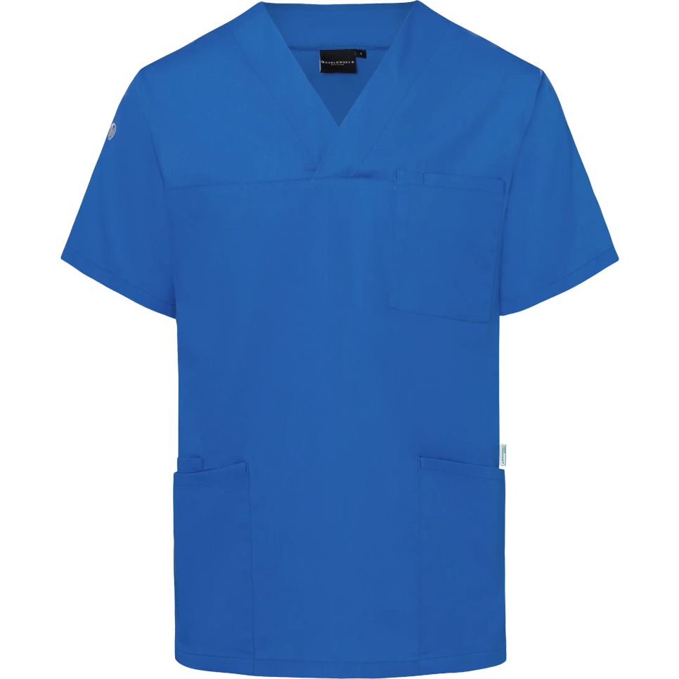La blouse tunique manches courtes pour homme présente un col en V et une coupe droite. Ce modèle convient aux secteurs de la santé et de la beauté. La composition est de 65 % polyester recyclé certifié et 35 % coton.