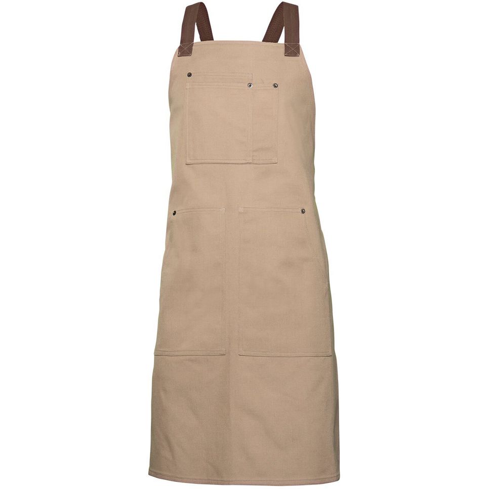 Le Tablier Bavette Canvas est un tablier canvas à bretelles croisées dans le dos, avec liens à nouer aux extrémités et rivets type jean. Les 4 poches incluent une double poche poitrine avec compartiment stylo et deux poches latérales.