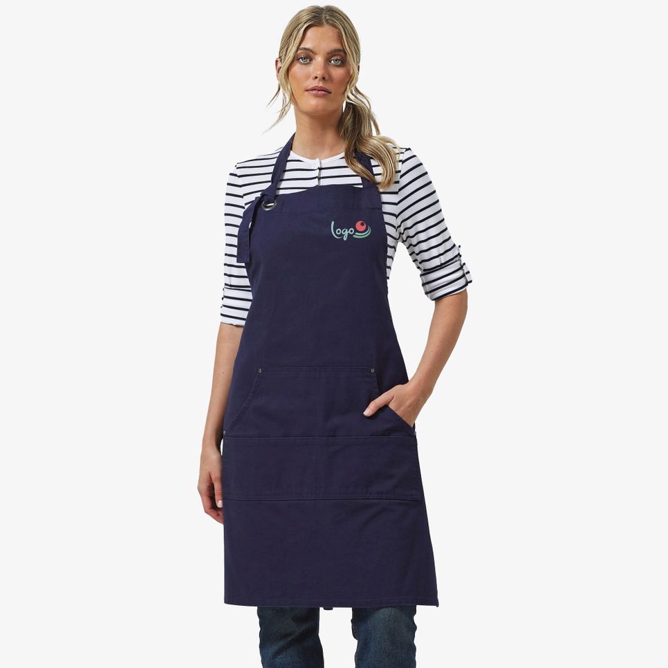 Le Tablier à Poche Toile Coton épais Calibre est un tablier bavette intégral en 100% coton, avec poche kangourou divisée en quatre compartiments. Lanière de cou ajustable via un œillet et finitions à rivets. Convient à la personnalisation.