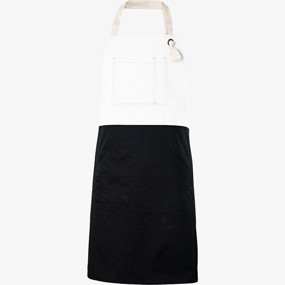 Le tablier bicolore avec tour de cou ajustable et liens à nouer permet de couvrir le buste et les jambes lors des activités de service ou de préparation. Les 3 poches facilitent le rangement d’accessoires. Personnalisable.