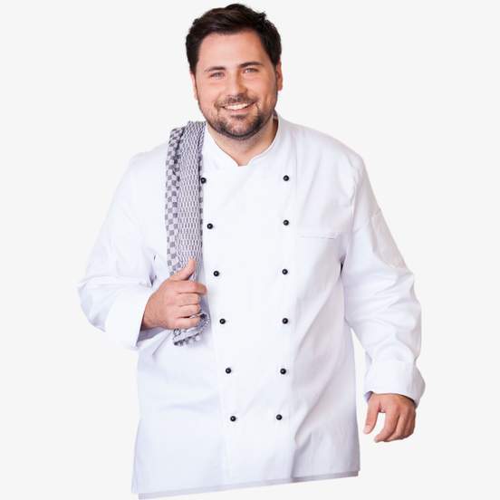 La Veste chef est une veste de cuisine à manches longues avec poignées doublées et poche intérieure poitrine passepoilée. Tissu doux, repassage facilité, boutons noirs inclus. Personnalisable.