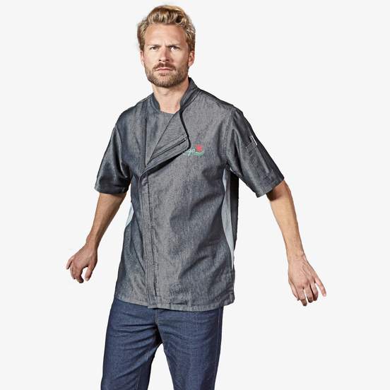 La Veste Cuisinier à Manches Courtes à Fermeture Zippée se porte en cuisine pour un habillage rapide, avec col mandarin et poche double stylo sur la manche gauche. Composition : 65% polyester, 35% coton (Denim : 60% coton, 40% polyester).