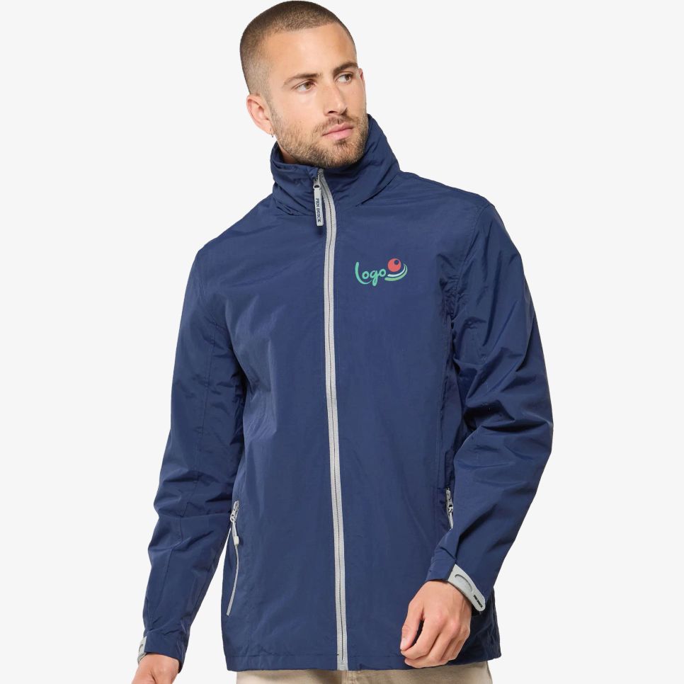 Le coupe-vent Adventure avec capuche intégrée dans le col et deux poches zippées latérales. Poignets ajustables et accès prévu pour personnaliser.