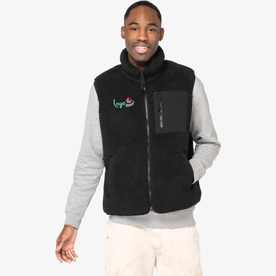 Le bodywarmer sherpa unisexe est conçu en polyester 100 % recyclé post consommation. Il présente une matière sherpa double face avec polaire intérieure ton sur ton. Le tissu est léger, chaud et doux. Le col est bi matière. Le zip milieu avant est en plastique recyclé avec tire-zip. Poche poitrine côté cœur et poche passepoilée côté matière ripstop contrastée sur certaines couleurs.