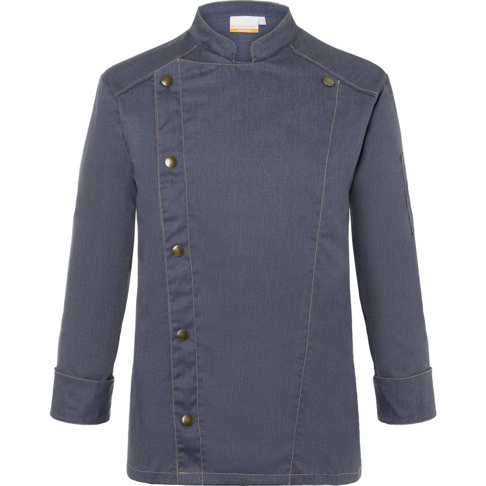 La veste cuisine jeans-style est conçue en polyester et coton (65 % polyester, 35 % coton). Elle dispose d'une fermeture asymétrique avec cinq boutons-pression et de surpiqûres contrastées. Un revers aux poignets est doté d'une fente. Une poche à stylos est plaquée sur la manche gauche.