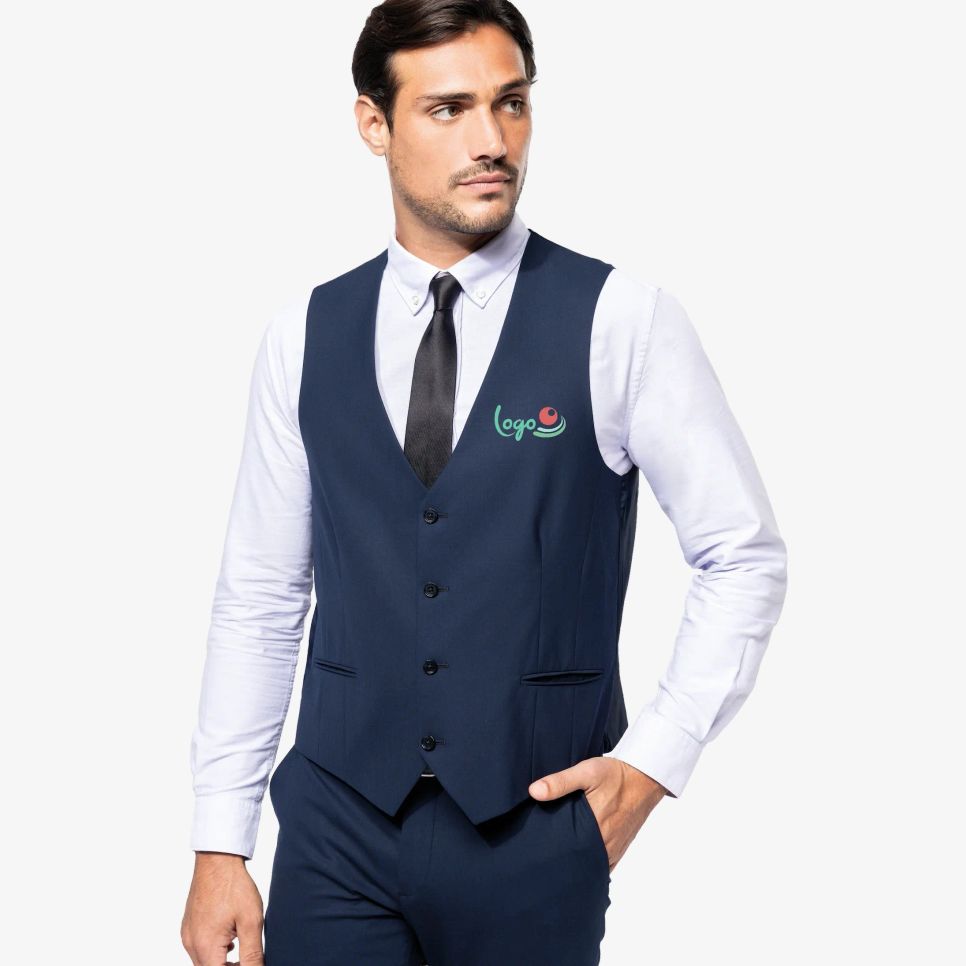 Le gilet homme à coupe ajustée convient aux tenues de travail ou d’accueil. Fermeture 4 boutons ton sur ton (1 bouton supplémentaire dès la taille 58), deux poches passepoilées et patte dos ajustable avec boucle métal. Sans étiquette marque, avec puce taille pour personnaliser. Composition : 50% polyester, 23% viscose, 22% laine, 5% élasthanne. Autre matière : twill 100% polyester sur l’extérieur dos et l’intérieur du vêtement.
