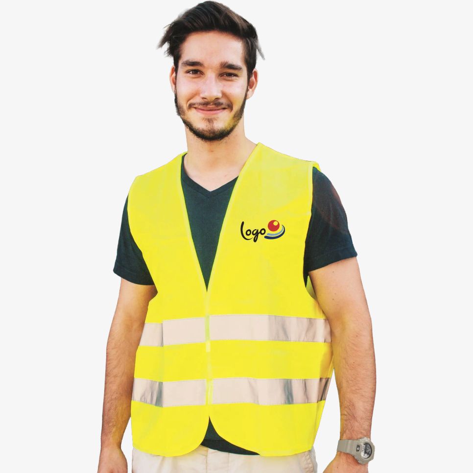Gilet de sécurité avec 2 bandes horizontales cousues. Fermeture par bande auto-agrippante. Composition : 100 % polyester.