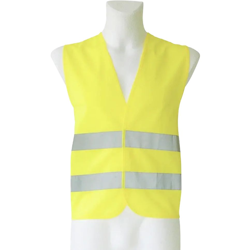 Gilet de sécurité avec 2 bandes horizontales cousues. Fermeture par bande auto-agrippante. Composition : 100 % polyester.