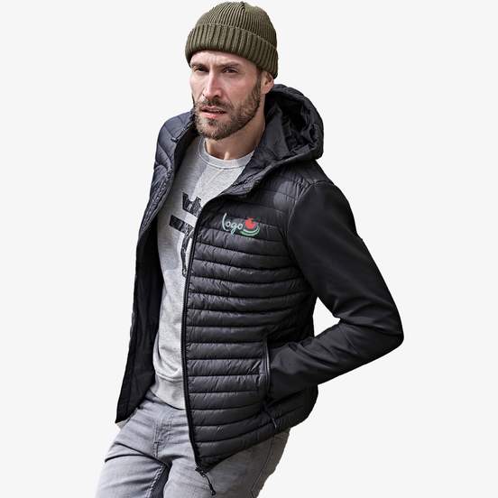 La Hooded Crossover Jacket est une veste homme bi-matière associant une partie matelassée et une partie softshell. Capuche ajustable, taille ajustable, poche poitrine zippée, deux grandes poches avant et une poche intérieure. Convient à une utilisation quotidienne et peut être personnalisé.