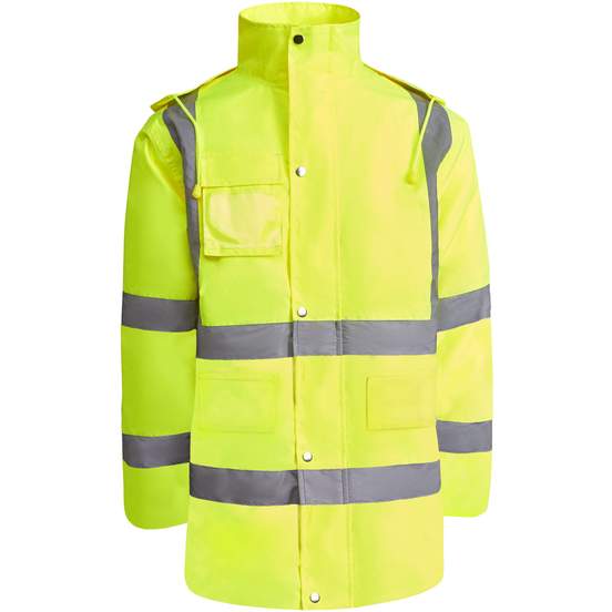 La parka haute visibilité Merak est une parka rembourrée en polyester, avec tissu imperméable et coutures thermosoudées. Bandes haute visibilité sur le buste, les manches, les épaules. Capuche pliable à cordon réglable, poches à rabat et poche intérieure zippée. Accès intérieur pour personnaliser. Composition : extérieur 100% polyester laminé 300d ; doublure 100% polyester ; ouate 100% polyester.