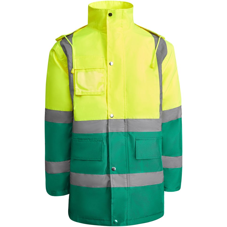 La parka haute visibilité Merak est une parka rembourrée en polyester, avec tissu imperméable et coutures thermosoudées. Bandes haute visibilité sur le buste, les manches, les épaules. Capuche pliable à cordon réglable, poches à rabat et poche intérieure zippée. Accès intérieur pour personnaliser. Composition : extérieur 100% polyester laminé 300d ; doublure 100% polyester ; ouate 100% polyester.