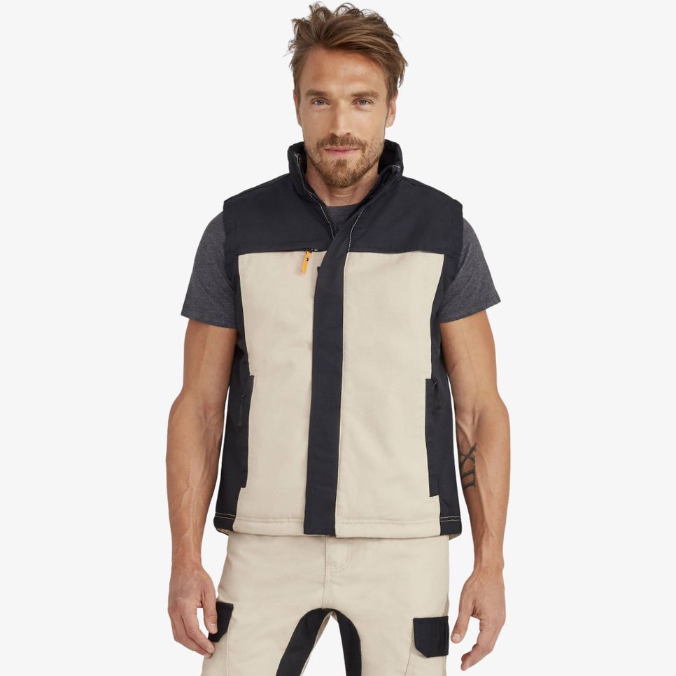 Le bodywarmer homme Mission pro est un modèle bicolore de style workwear, avec col montant doublé polaire et ouverture zip avec patte de protection. 4 poches dont une intérieure, passepoil réfléchissant au dos, cordon de resserrage intérieur et emmanchures élastiquées. Personnalisable.