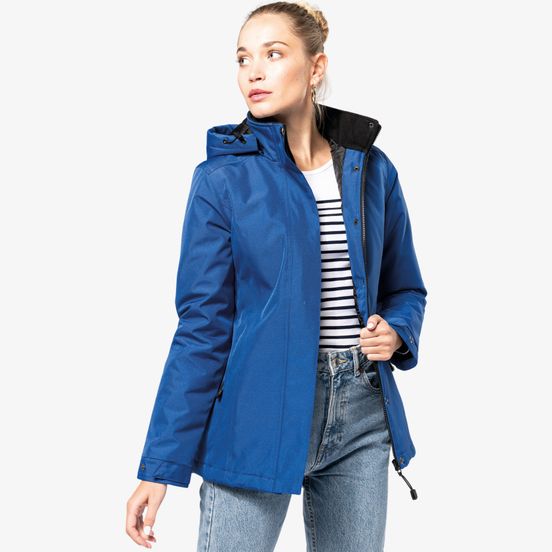 La Parka Femme est une parka femme avec extérieur en polyester oxford et intérieur matelassé. Fermeture zippée avec patte à pressions invisibles, capuche amovible, col doublé polaire, deux poches extérieures zippées et une poche intérieure. Zip prévu pour personnalisation.