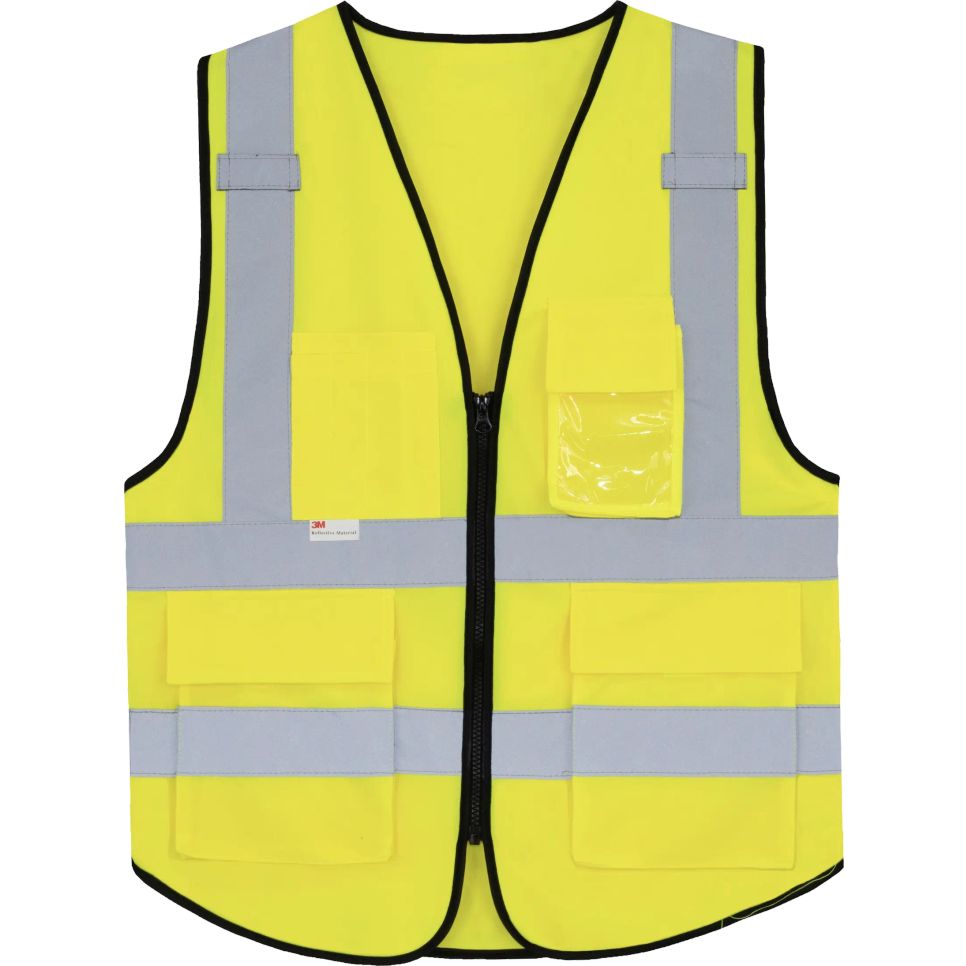 Gilet de sécurité zippé. 2 bandes réfléchissantes 3M® horizontales et verticales de 5 cm de large. 2 poches avec rabats bande auto-agrippante. Multifonctionnel : poche pour carte d'identité, poche pour téléphone, porte-stylo, boucle radio. Fermeture grand zip. Composition : 100 % polyester.
