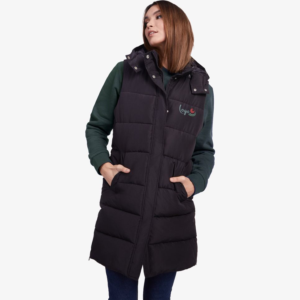 La doudoune Reine femme sans manches, rembourrée, avec capuche amovible et col montant. Fermeture zippée avant sous rabat, poches à bouton-pression et ouvertures latérales zippées. Accès intérieur poitrine pour personnaliser. Composition : extérieur 100% polyester, rembourrage 100% polyester, doublure 100% polyester.