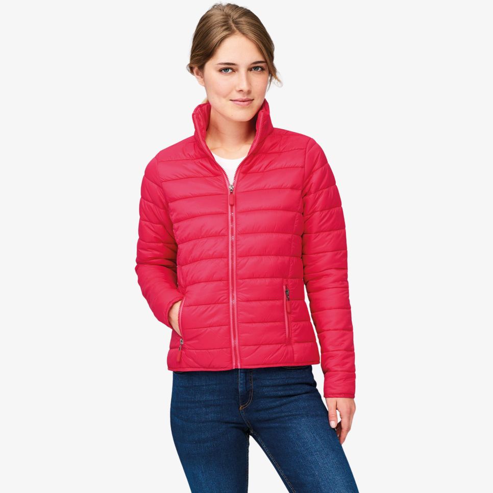 La doudoune Ride Women en nylon avec col montant et coupe près du corps convient aux usages quotidiens. 2 poches zippées et finitions biais ton sur ton. Modèle personnalisé.