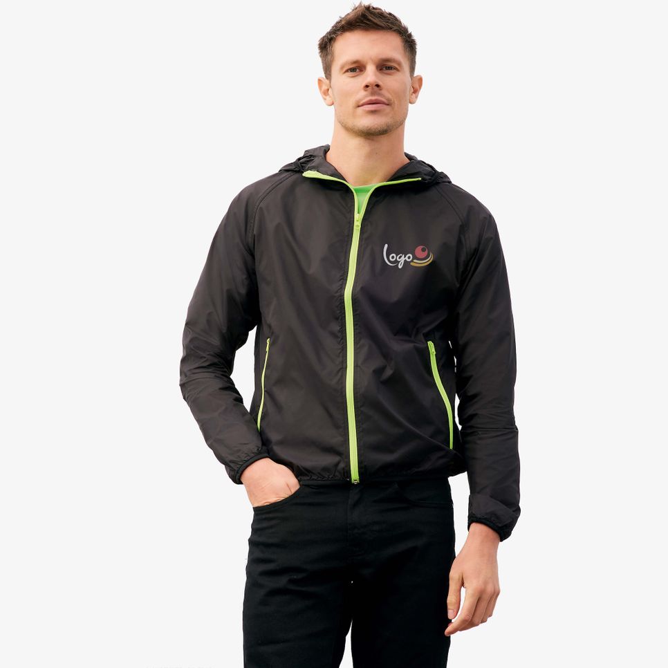 Le coupe-vent Shore en nylon 210T convient aux sorties par temps humide. Capuche, bas et poignets élastiqués, manches raglan et poches latérales zippées. Système de pliage dans sa poche. Personnalisable.