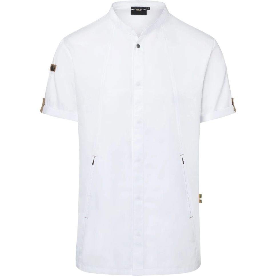 La veste cuisine manches courtes green-generation présente une coupe légèrement fuselée. Elle est équipée de boutons-pression et comprend plusieurs poches dont deux zippées à l'avant et une poche passepoilée sur la manche gauche. La composition associe 72 % de polyester recyclé certifié et 28 % de coton.