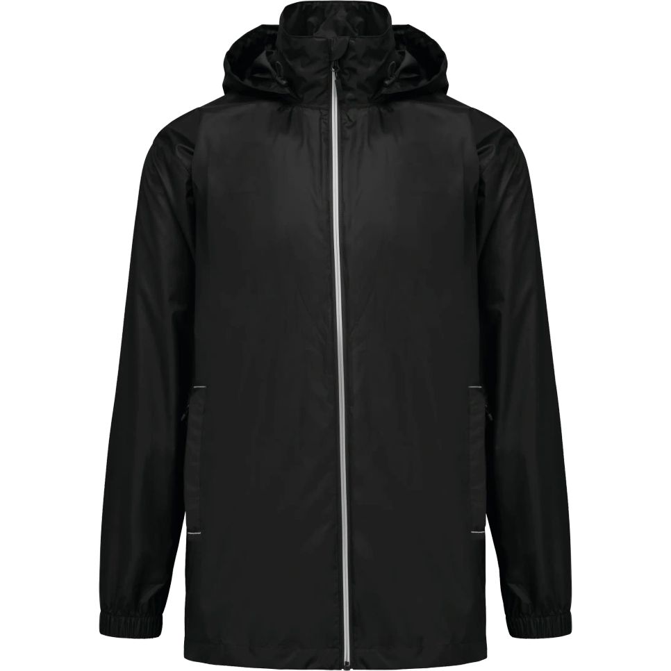 La Veste Pluie Unisexe est un coupe-vent imperméable en tissu 1500 mm avec coutures thermosoudées. Capuche réglable, fermeture devant par zip, poches latérales zippées et poches intérieures. Personnalisable.