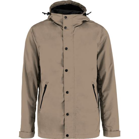 Veste écoresponsable à capuche unisexe. Boutons pression electrostatic paint et métal. Tissu déperlant. Zips en plastique et puller en métal. Poches latérales côtés à zips retournés (waterproof). Capuche panneaux, doublée en polyamide ripstop quadrillé. Bande auto-agrippante aux bas de manches + demi-élastique. Doublure intérieure en ripstop volante au dos pour faciliter la personnalisation. Finition biais à l'emmanchure, côtés vêtement et intérieur de manches. Œillets d'aération dos sous les manches. Élastique bas de vêtement, cordon de serrage avec stopper sur les côtés. Patte de boutonnage avec boutons pressions sur le milieu devant. Composition : 87% polyester (35% recyclé), 13% polyamide.