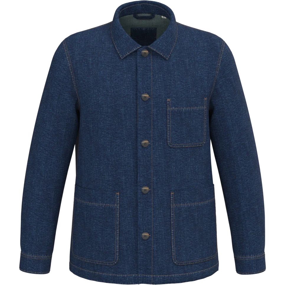 La veste jean à épaules tombantes unisexe présente une coupe standard et un denim 100 % coton biologique. Elle comprend une patte de boutonnage rapportée avec boutons en plastique recyclé effet corne, une poche poitrine plaquée côté cœur, deux poches plaquées basses, un col avec pied de col fantaisie et un patch de personnalisation en matière principale avec bride de suspension à l'intérieur. Le poignet est boutonné avec fente, et l'ourlet simple est surpiqué.