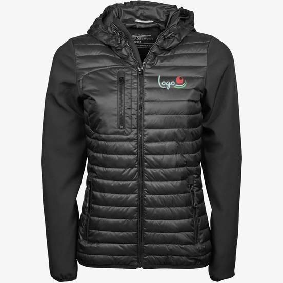 La Veste Croisée Capuche est une veste bi-matière pour femme, associant une partie matelassée et une partie softshell. Capuche ajustable, taille ajustable et poignets élastiqués pour un usage quotidien. Poche poitrine zippée, deux grandes poches avant et une poche intérieure. Personnalisable.