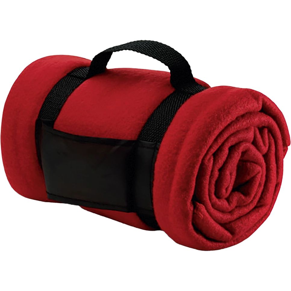 Couverture polaire avec poignée en nylon. Dimensions : 150 x 120 cm. Composition : 100% polyester.